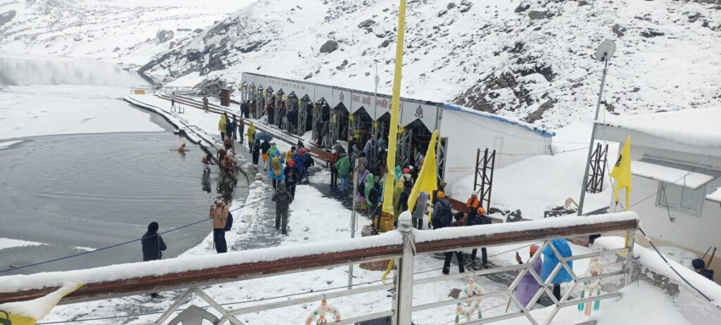 चमोली/देहरादून। श्री हेमकुंड साहिब, जो सिख धर्म के सबसे पवित्र तीर्थ स्थलों में से एक है, में पिछले चार दिनों से रुक-रुक कर हो रही बर्फबारी के बावजूद तीर्थयात्रियों का उत्साह चरम पर है। हिमालय की गोद में 15,000 फीट से अधिक की ऊंचाई पर स्थित इस पवित्र गुरुद्वारे में तीर्थयात्री अटूट श्रद्धा और विश्वास के साथ पहुंच रहे हैं।