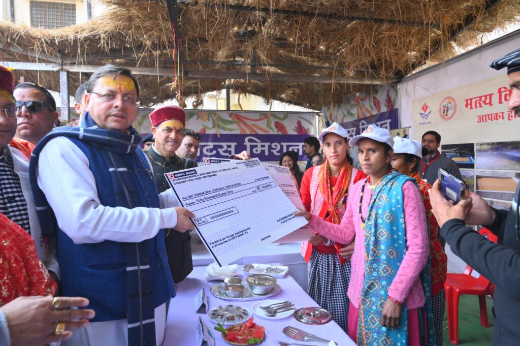 रोड-शो के बाद सीएम ने रामलीला मैदान में बद्री गाय की पूजा अर्चना कर ‘विकसित भारत विकसित ग्राम‘ प्रदर्शनी का उद्घाटन किया। उन्होंने प्रदर्शनी स्टॉलो का निरीक्षण करने के साथ ही विभिन्न योजनाओं के लाभार्थियों से संवाद भी किया और विभिन्न योजना के लाभार्थियों को चेक वितरित किए। इस मौके पर उन्होंने ने ‘वन डिस्ट्रिक वन प्रोडक्ट‘ नेशन अवार्ड में देश में दूसरे स्थान का सम्मान पाने वाले लाल धान की जानकारी ली। महिला किसानों ने सीएम को लाल धान की बाली भेंट की। इस मौके पर मुख्यमंत्री ने गिंज्याली (मूसल) थामकर पारंपरिक ओखली में महिलाओं के साथ लाल धान की कुटाई की तथा लाल धान के चिवड़ा बनाने की जानकारी ली। सीएम ने डुंडा और बगोरी क्षेत्र के पारंपरिक ऊन उत्पादकों से भेंट कर ऊनी ऊन बुनाई व कताई के बारे में जानकारी ली और चरखा भी चलाया।