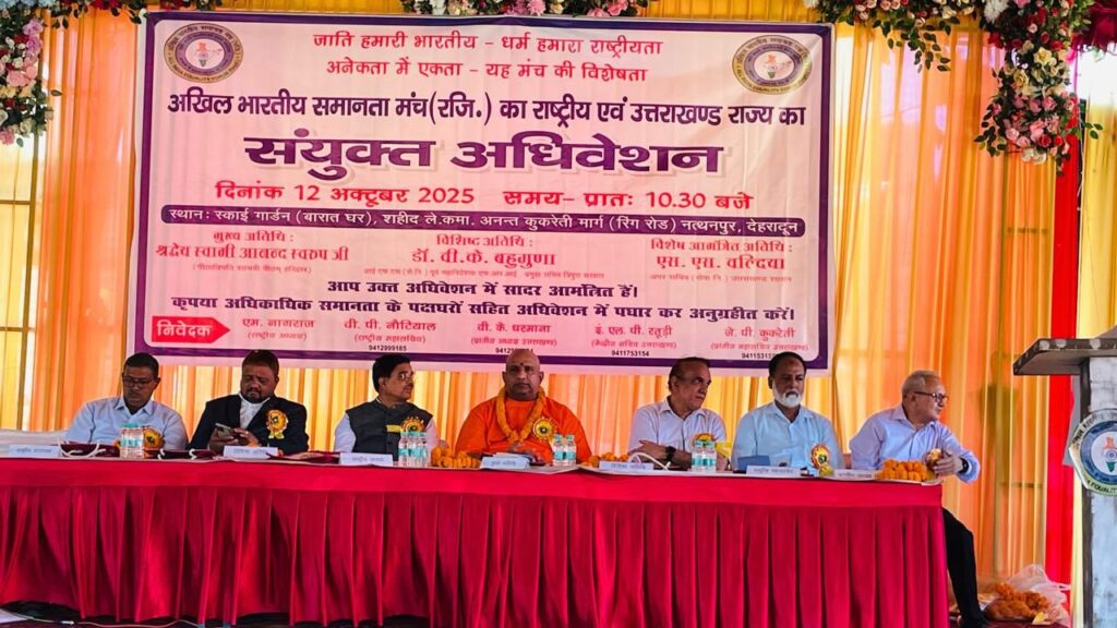 देहरादून । अखिल भारतीय समानता मंच का राष्ट्रीय एवं प्रांतीय (उत्तराखंड) का संयुक्त अधिवेशन रविवार को संपन्न हुआ।अधिवेशन की अध्यक्षता राष्ट्रीय अध्यक्ष इं.एम नागराज एवं संचालन राष्ट्रीय महासचिव इं. वीपी नौटियाल एवं प्रांतीय महासचिव जेपी कुकरेती के ने संयुक्त रूप से किया । मुख्य अतिथि के रूप में शाम्भवी पीठम् के पीठाधीश्वर स्वामी आनंद स्वरूप उपस्थित रहे।